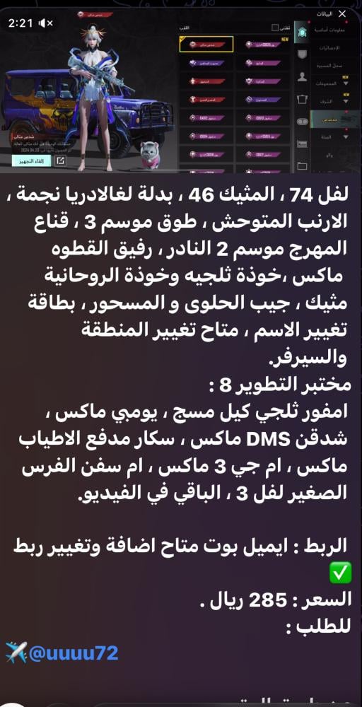 لفل 74 ، المثيك 46 ، بدلة لغالادريا نجمة ، الارنب المتوحش ، طوق موسم 3 ، قناع المهرج موسم 2 النادر ، رفيق القطوه ماكس ،خوذة ثلجيه وخوذة الروحانية مثيك ، جيب الحلوى و المسحور ، بطاقة تغيير الاسم ، متاح تغيير المنطقة والسيرفر.
